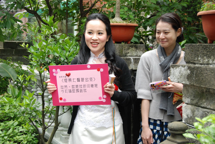 第一關,愛的大聲公還是一定要過的...依造關主的規定要在樓下大喊:「你是我的可樂果,今天請你嫁給我,可樂果"SHO"酥啦」(汪小e 不知不覺加了一句)
